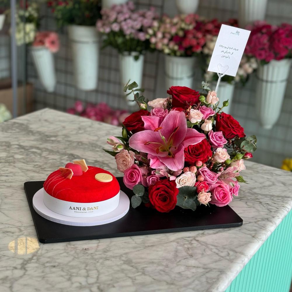 تنسيق كيك اني وداني بمجموعة من الورود الطببعية المنوعة